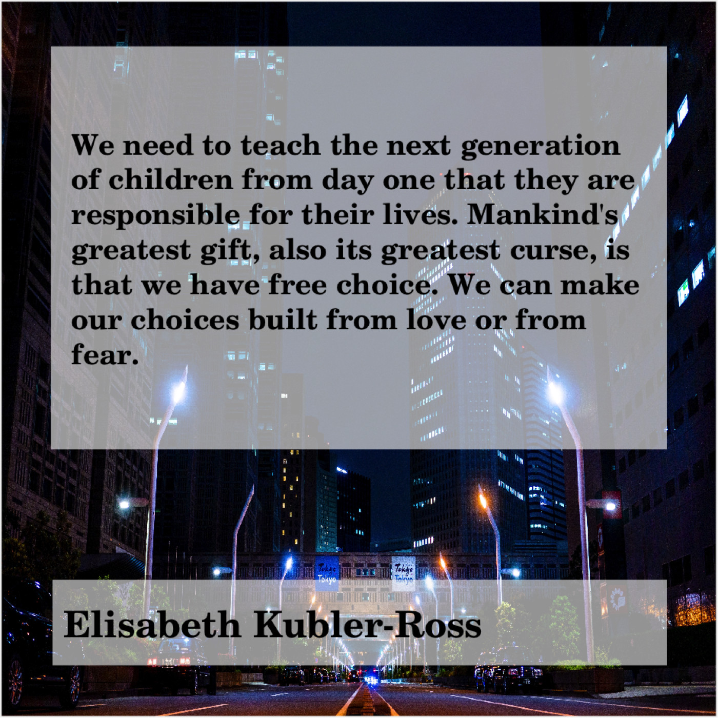 “We need to teach the next generation of children from day one that they are responsible for their lives. Mankind’s greatest gift, also its greatest curse, is that we have free choice. We can make our choices built from love or from fear.”