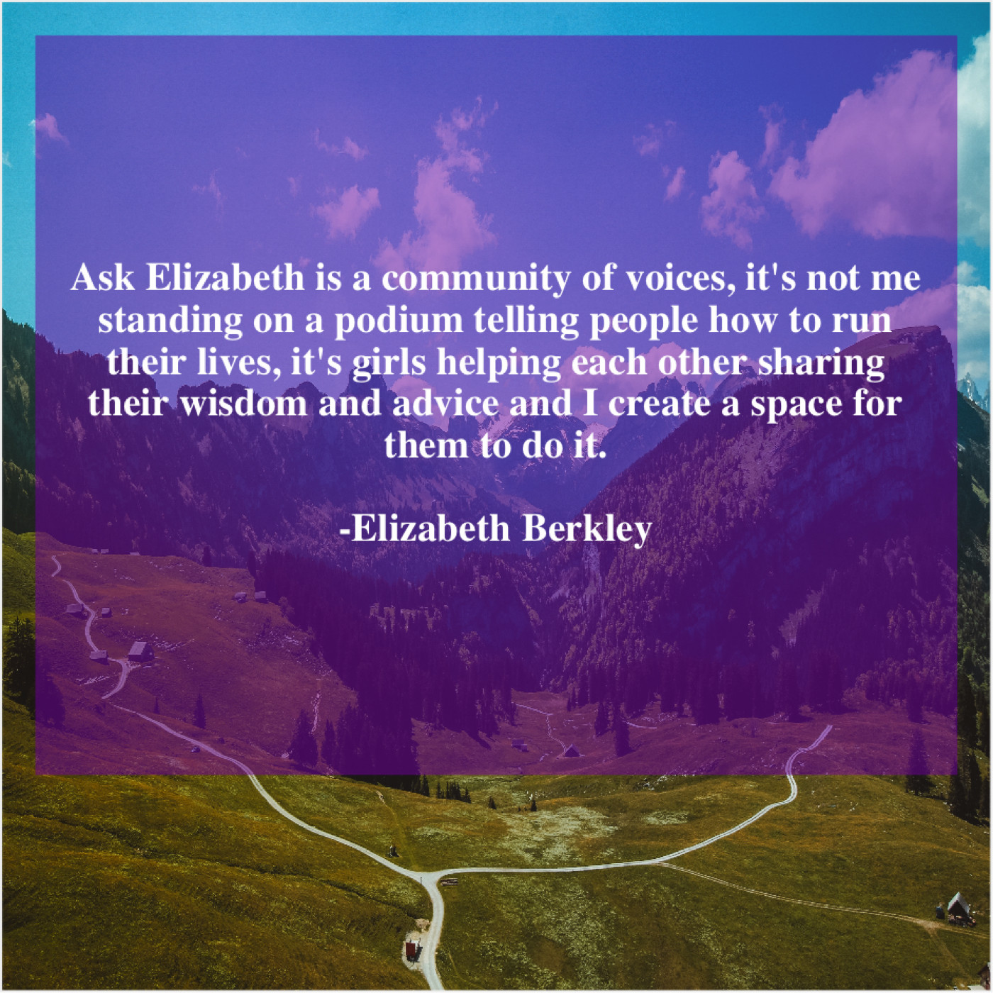 Elizabeth Berkley Elizabeth Berkley – Ask Elizabeth is a community… January 21, 2019 admin “Ask Elizabeth is a community of voices, it’s not me standing on a podium telling people how to run their lives, it’s girls helping each other sharing their wisdom and advice and I create a space for them to do it.”-Elizabeth Berkley