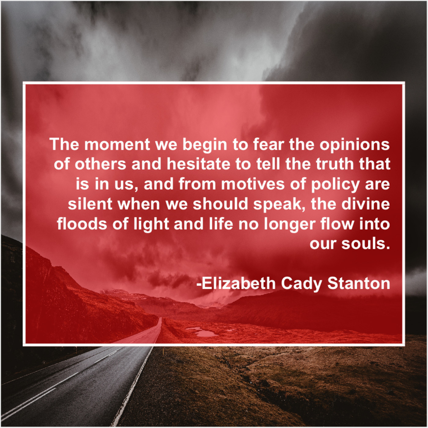 Elizabeth Cady Stanton Elizabeth Cady Stanton – The moment we begin to… July 31, 2019 admin “The moment we begin to fear the opinions of others and hesitate to tell the truth that is in us, and from motives of policy are silent when we should speak, the divine floods of light and life no longer flow into our souls.”-Elizabeth Cady Stanton