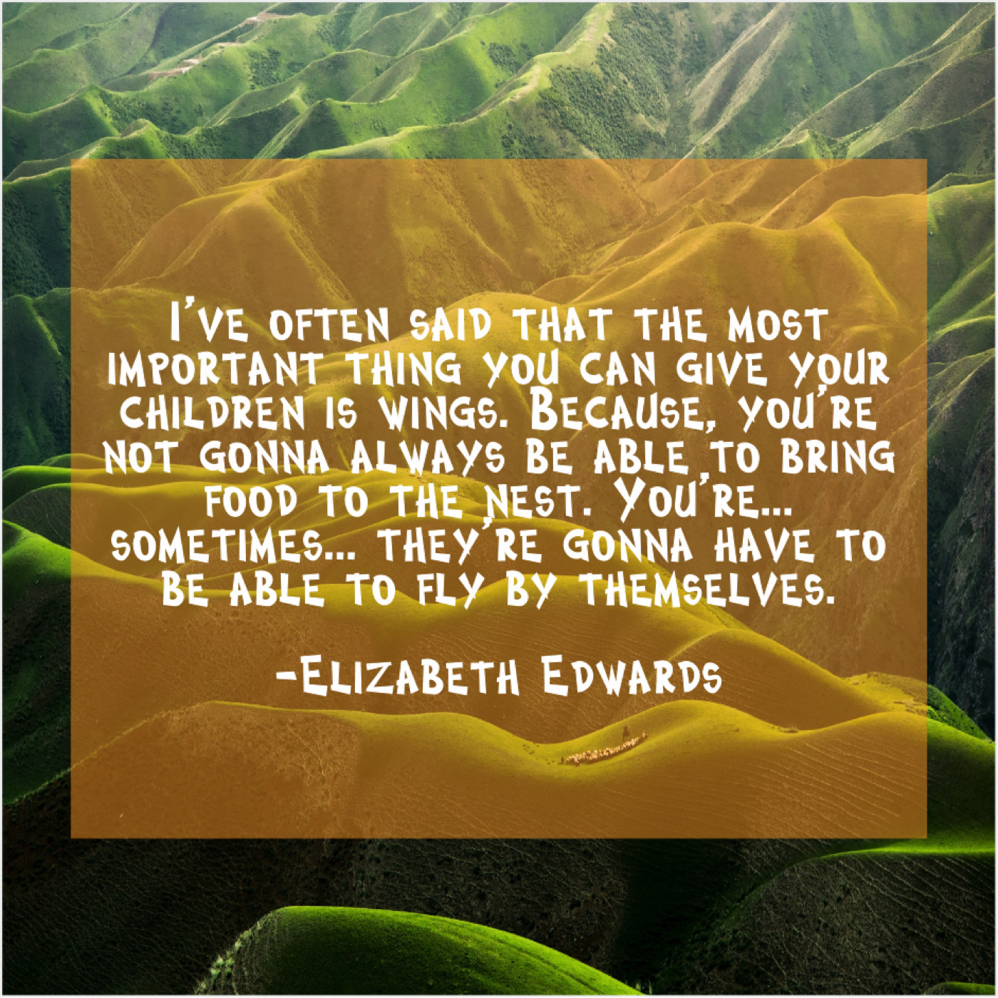 Elizabeth Edwards Elizabeth Edwards – I’ve often said that the… July 17, 2019 admin “I’ve often said that the most important thing you can give your children is wings. Because, you’re not gonna always be able to bring food to the nest. You’re… sometimes… they’re gonna have to be able to fly by themselves.”-Elizabeth Edwards