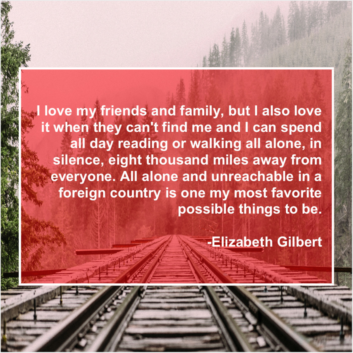 “I love my friends and family, but I also love it when they can’t find me and I can spend all day reading or walking all alone, in silence, eight thousand miles away from everyone. All alone and unreachable in a foreign country is one my most favorite possible things to be.”