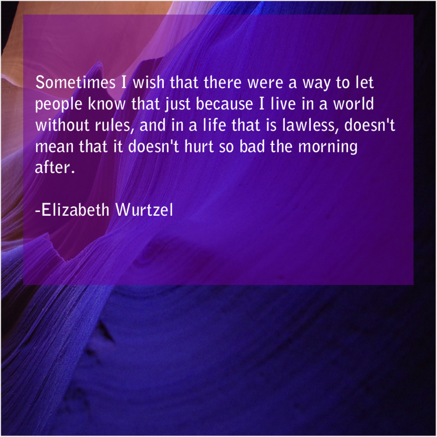 Elizabeth Wurtzel Elizabeth Wurtzel – Sometimes I wish that there… March 23, 2019 admin “Sometimes I wish that there were a way to let people know that just because I live in a world without rules, and in a life that is lawless, doesn’t mean that it doesn’t hurt so bad the morning after.”-Elizabeth Wurtzel