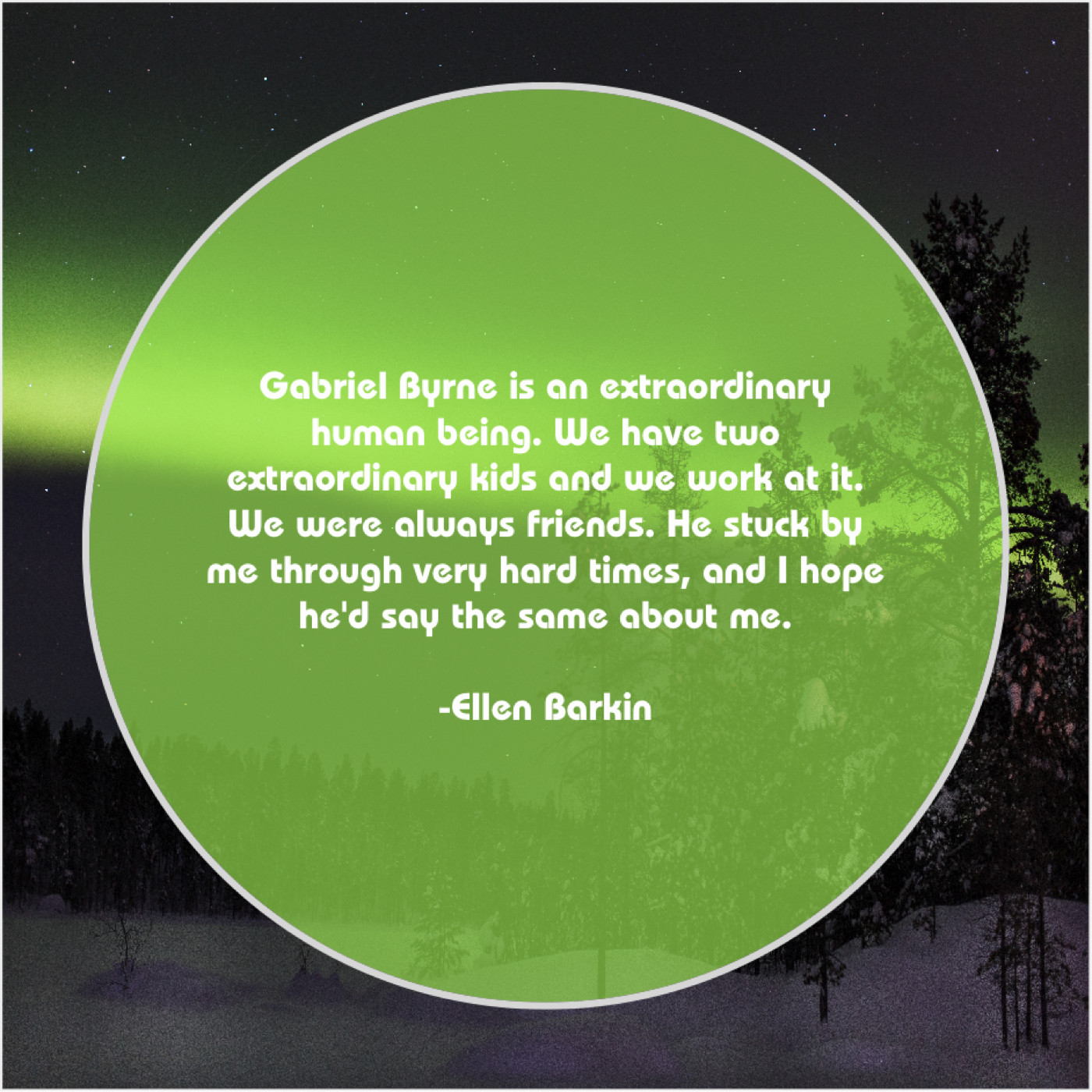 Ellen Barkin Ellen Barkin – Gabriel Byrne is an extraordinary… July 13, 2019 admin “Gabriel Byrne is an extraordinary human being. We have two extraordinary kids and we work at it. We were always friends. He stuck by me through very hard times, and I hope he’d say the same about me.”-Ellen Barkin