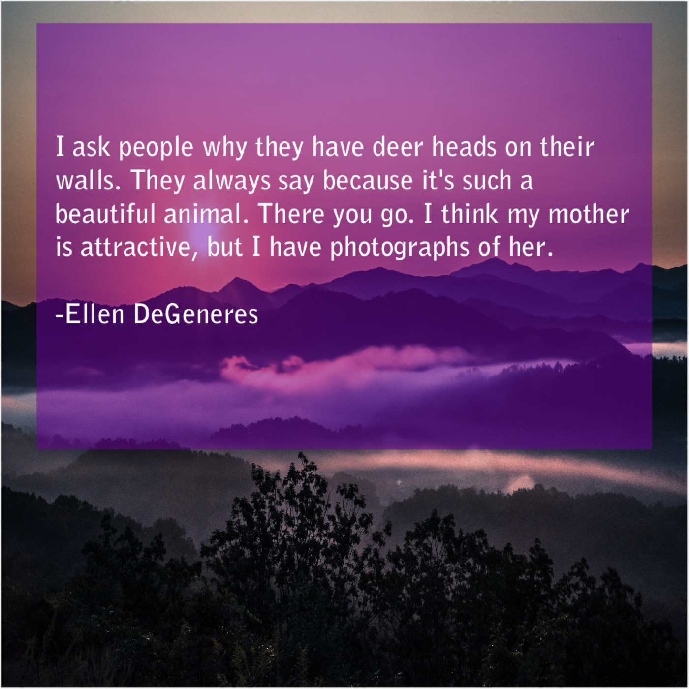 Ellen DeGeneres Ellen DeGeneres – I ask people why they… August 9, 2019 admin “I ask people why they have deer heads on their walls. They always say because it’s such a beautiful animal. There you go. I think my mother is attractive, but I have photographs of her.”-Ellen DeGeneres