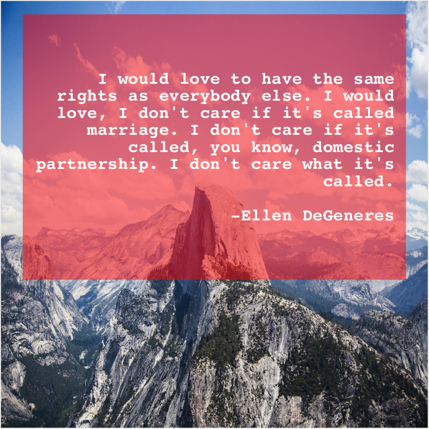 Ellen DeGeneres Ellen DeGeneres – I would love to have… October 14, 2019 admin “I would love to have the same rights as everybody else. I would love, I don’t care if it’s called marriage. I don’t care if it’s called, you know, domestic partnership. I don’t care what it’s called.”-Ellen DeGeneres