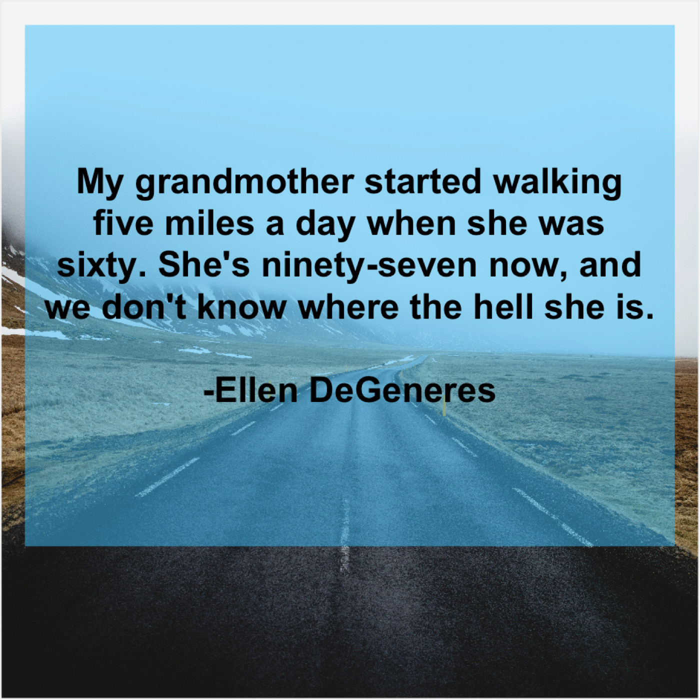 Ellen DeGeneres Ellen DeGeneres – My grandmother started walking five… September 6, 2019 admin “My grandmother started walking five miles a day when she was sixty. She’s ninety-seven now, and we don’t know where the hell she is.”-Ellen DeGeneres