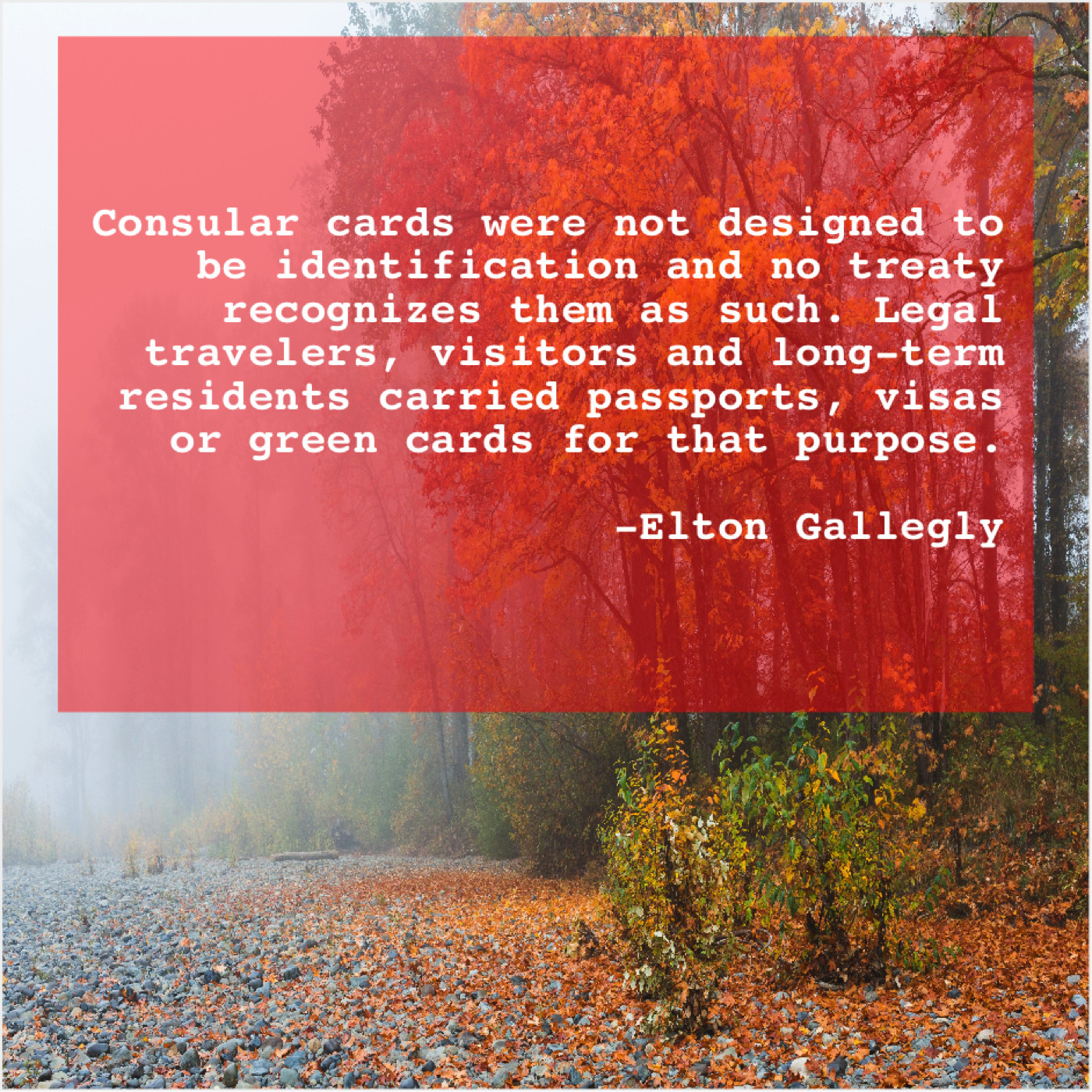 Elton Gallegly Elton Gallegly – Consular cards were not designed… August 10, 2019 admin “Consular cards were not designed to be identification and no treaty recognizes them as such. Legal travelers, visitors and long-term residents carried passports, visas or green cards for that purpose.”-Elton Gallegly