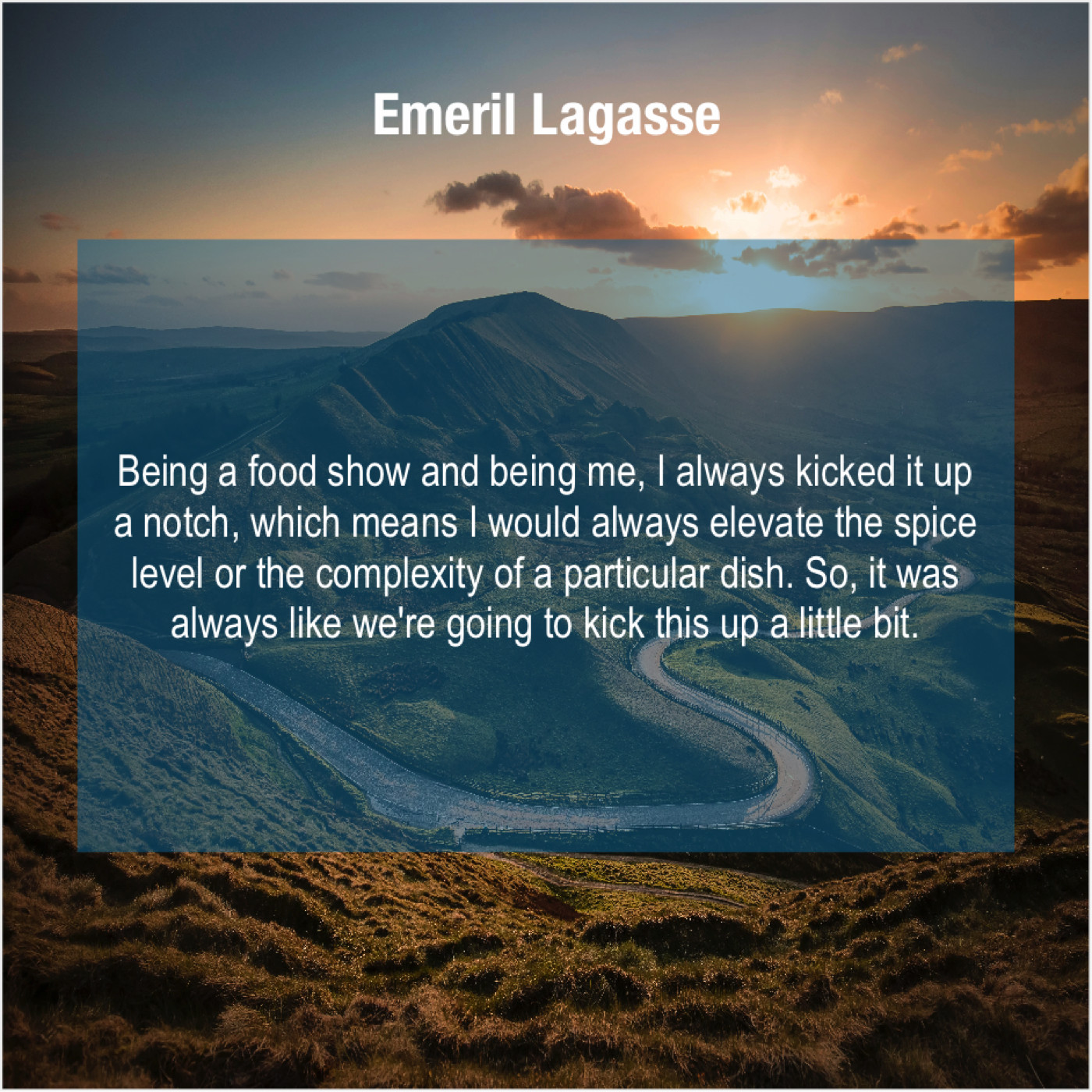 Emeril Lagasse Emeril Lagasse – Being a food show and… October 8, 2019 admin “Being a food show and being me, I always kicked it up a notch, which means I would always elevate the spice level or the complexity of a particular dish. So, it was always like we’re going to kick this up a little bit.”-Emeril Lagasse