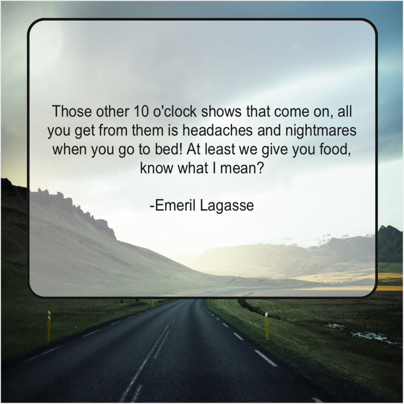 Emeril Lagasse Emeril Lagasse – Those other 10 o’clock shows… August 4, 2019 admin “Those other 10 o’clock shows that come on, all you get from them is headaches and nightmares when you go to bed! At least we give you food, know what I mean?”-Emeril Lagasse