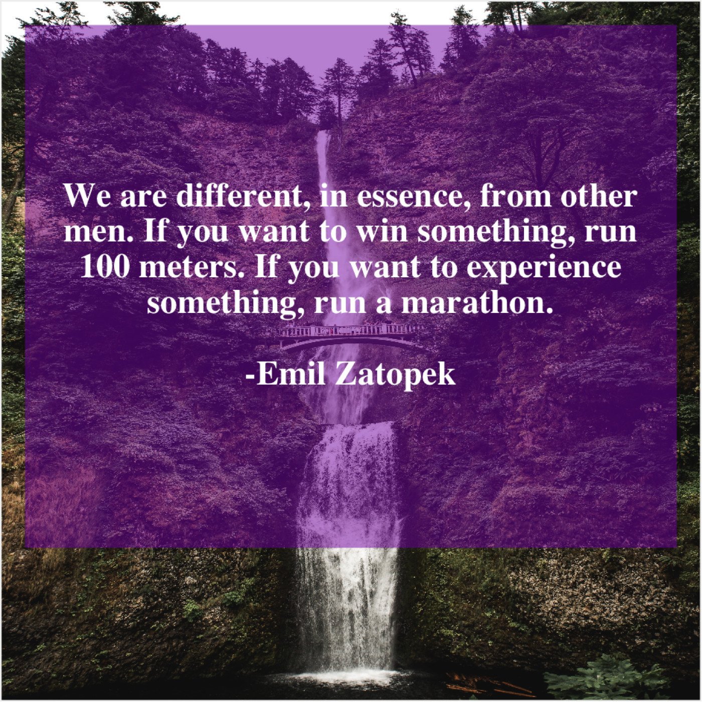 Emil Zatopek Emil Zatopek – We are different, in essence… December 9, 2018 admin “We are different, in essence, from other men. If you want to win something, run 100 meters. If you want to experience something, run a marathon.”-Emil Zatopek