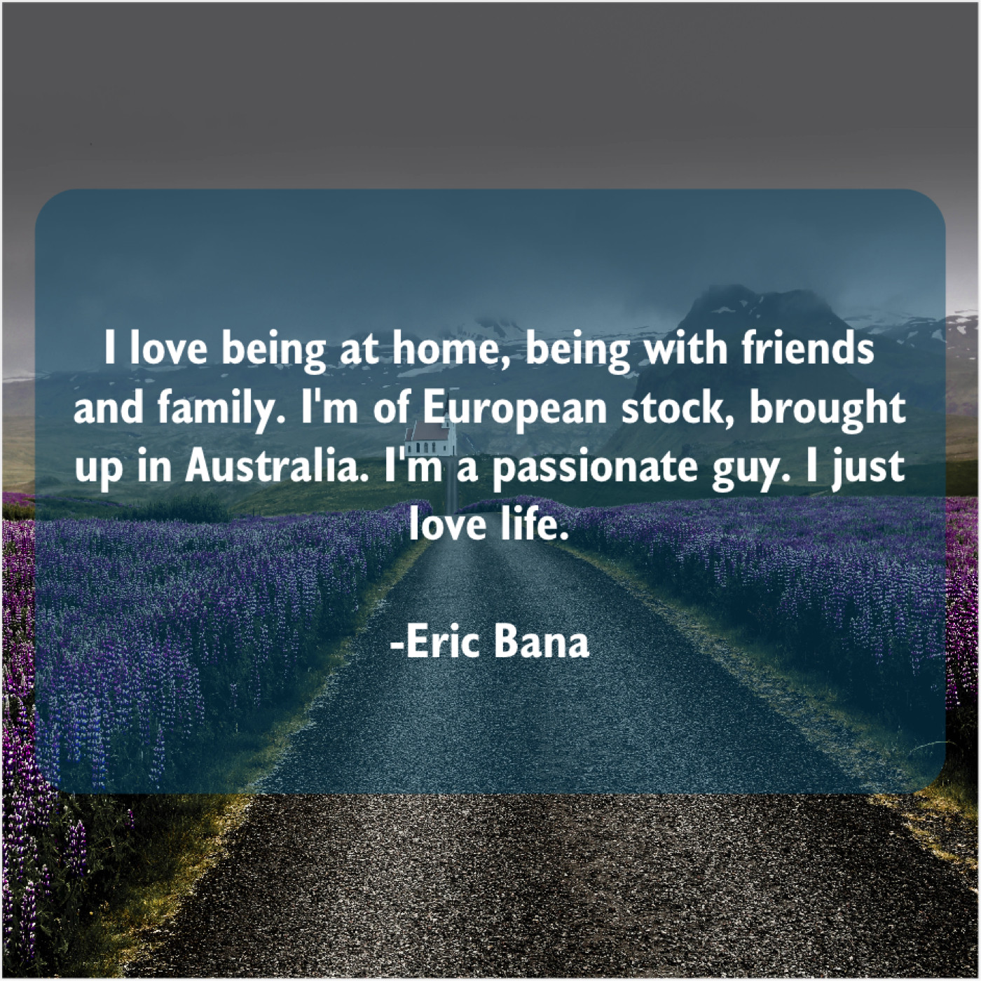 Eric Bana Eric Bana – I love being at home… September 21, 2019 admin “I love being at home, being with friends and family. I’m of European stock, brought up in Australia. I’m a passionate guy. I just love life.”-Eric Bana