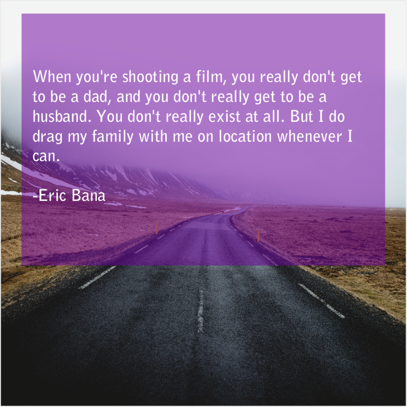 Eric Bana Eric Bana – When you’re shooting a film… July 20, 2019 admin “When you’re shooting a film, you really don’t get to be a dad, and you don’t really get to be a husband. You don’t really exist at all. But I do drag my family with me on location whenever I can.”-Eric Bana