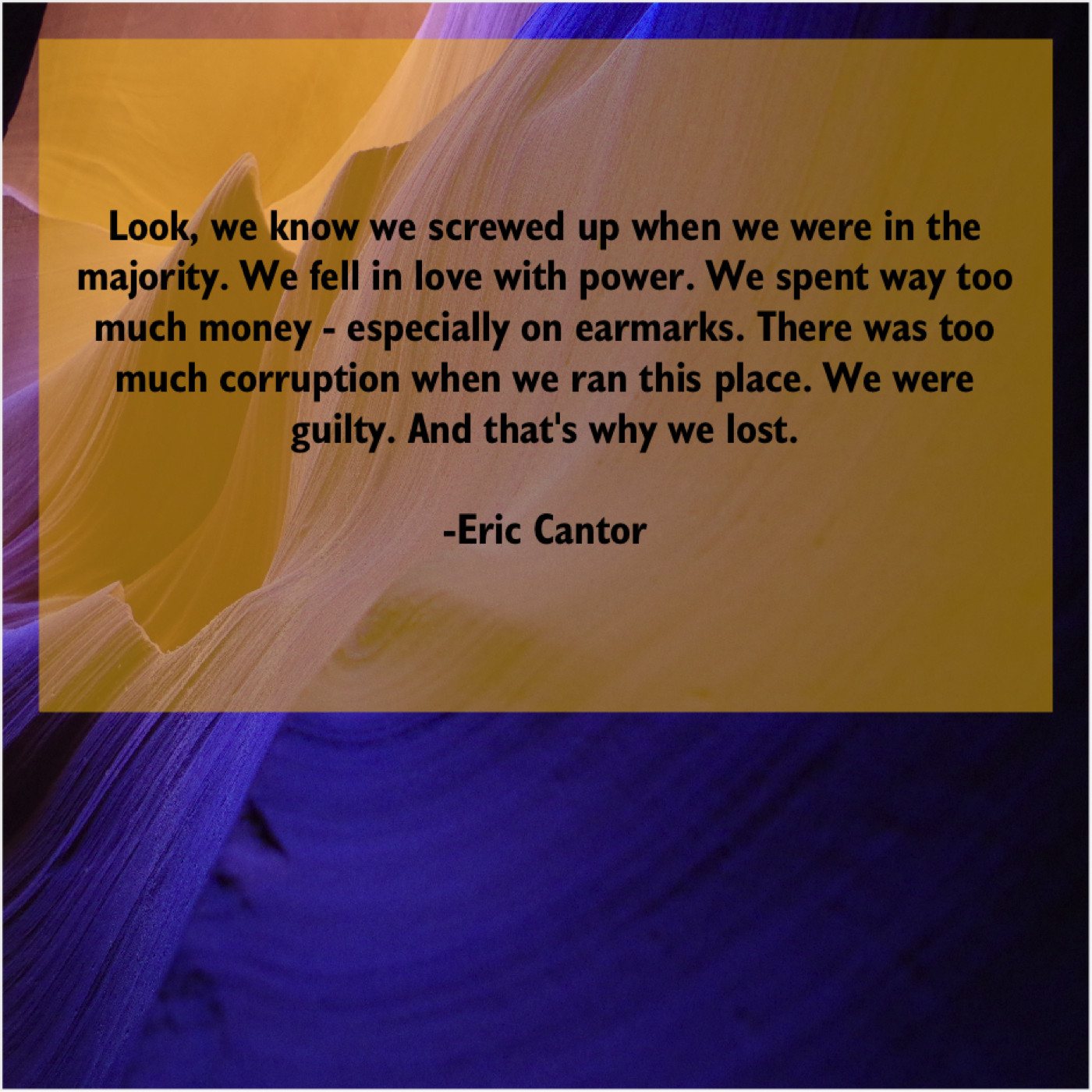 Eric Cantor Eric Cantor – Look, we know we screwed… December 17, 2018 admin “Look, we know we screwed up when we were in the majority. We fell in love with power. We spent way too much money – especially on earmarks. There was too much corruption when we ran this place. We were guilty. And that’s why we lost.”-Eric Cantor
