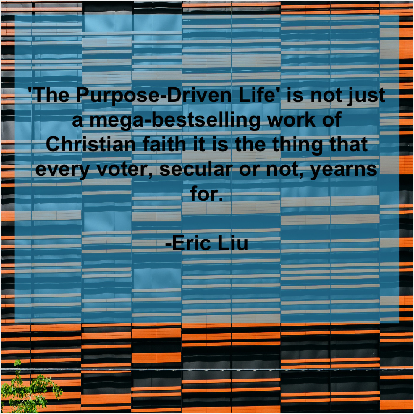Eric Liu Eric Liu – The Purpose-Driven Life’ is… June 2, 2019 admin “‘The Purpose-Driven Life’ is not just a mega-bestselling work of Christian faith it is the thing that every voter, secular or not, yearns for.”-Eric Liu