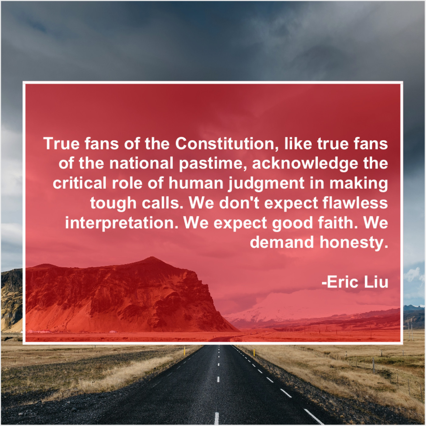 Eric Liu Eric Liu – True fans of the Constitution… March 29, 2019 admin “True fans of the Constitution, like true fans of the national pastime, acknowledge the critical role of human judgment in making tough calls. We don’t expect flawless interpretation. We expect good faith. We demand honesty.”-Eric Liu