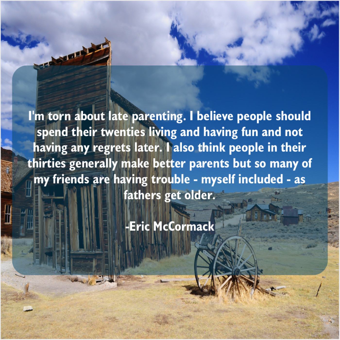 “I’m torn about late parenting. I believe people should spend their twenties living and having fun and not having any regrets later. I also think people in their thirties generally make better parents but so many of my friends are having trouble – myself included – as fathers get older.”