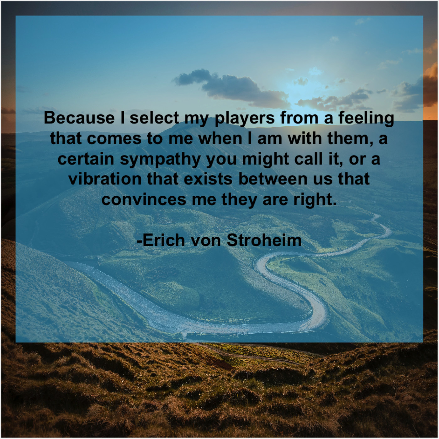 Erich von Stroheim Erich von Stroheim – Because I select my players… April 20, 2019 admin “Because I select my players from a feeling that comes to me when I am with them, a certain sympathy you might call it, or a vibration that exists between us that convinces me they are right.”-Erich von Stroheim