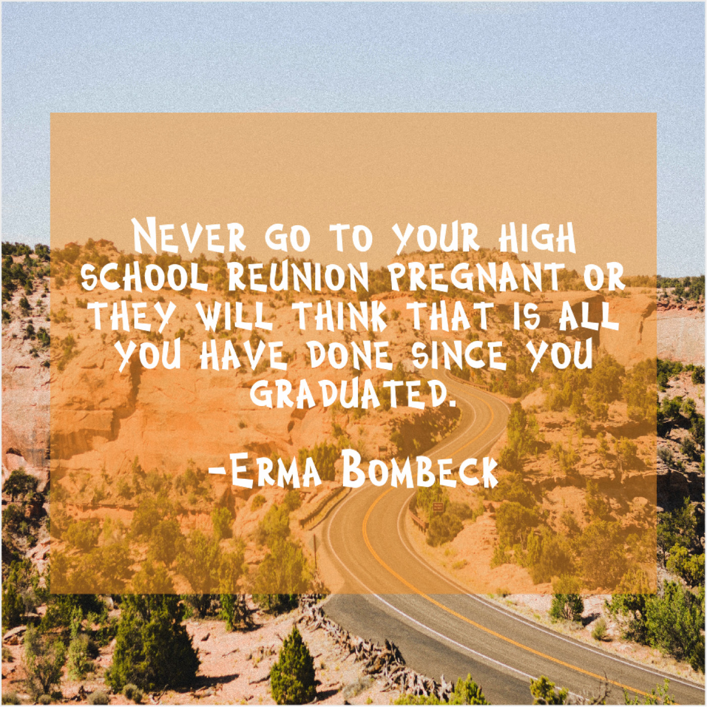 Erma Bombeck Erma Bombeck – Never go to your high… July 29, 2019 admin “Never go to your high school reunion pregnant or they will think that is all you have done since you graduated.”-Erma Bombeck