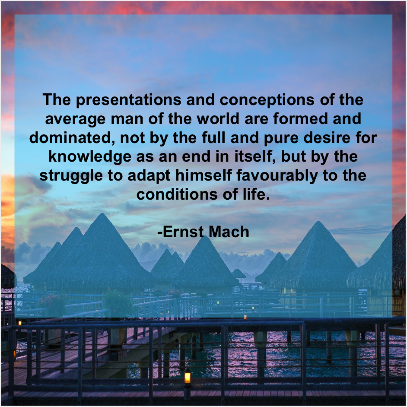 Ernst Mach Ernst Mach – The presentations and conceptions of… December 9, 2018 admin “The presentations and conceptions of the average man of the world are formed and dominated, not by the full and pure desire for knowledge as an end in itself, but by the struggle to adapt himself favourably to the conditions of life.”-Ernst Mach