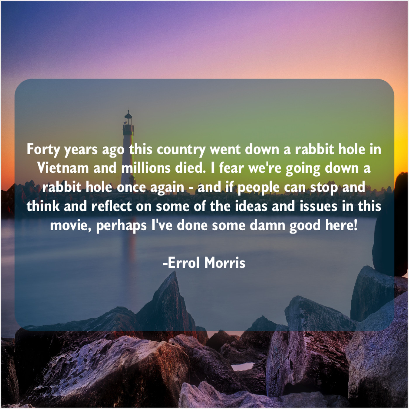 “Forty years ago this country went down a rabbit hole in Vietnam and millions died. I fear we’re going down a rabbit hole once again – and if people can stop and think and reflect on some of the ideas and issues in this movie, perhaps I’ve done some damn good here!”