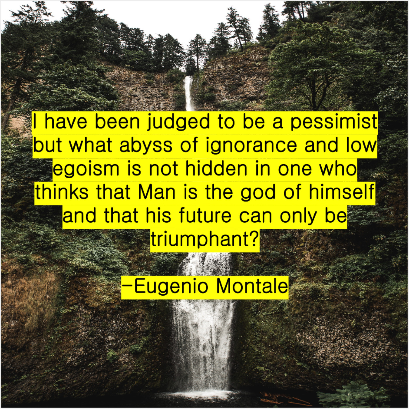 Eugenio Montale Eugenio Montale – I have been judged to… December 14, 2018 admin “I have been judged to be a pessimist but what abyss of ignorance and low egoism is not hidden in one who thinks that Man is the god of himself and that his future can only be triumphant?”-Eugenio Montale
