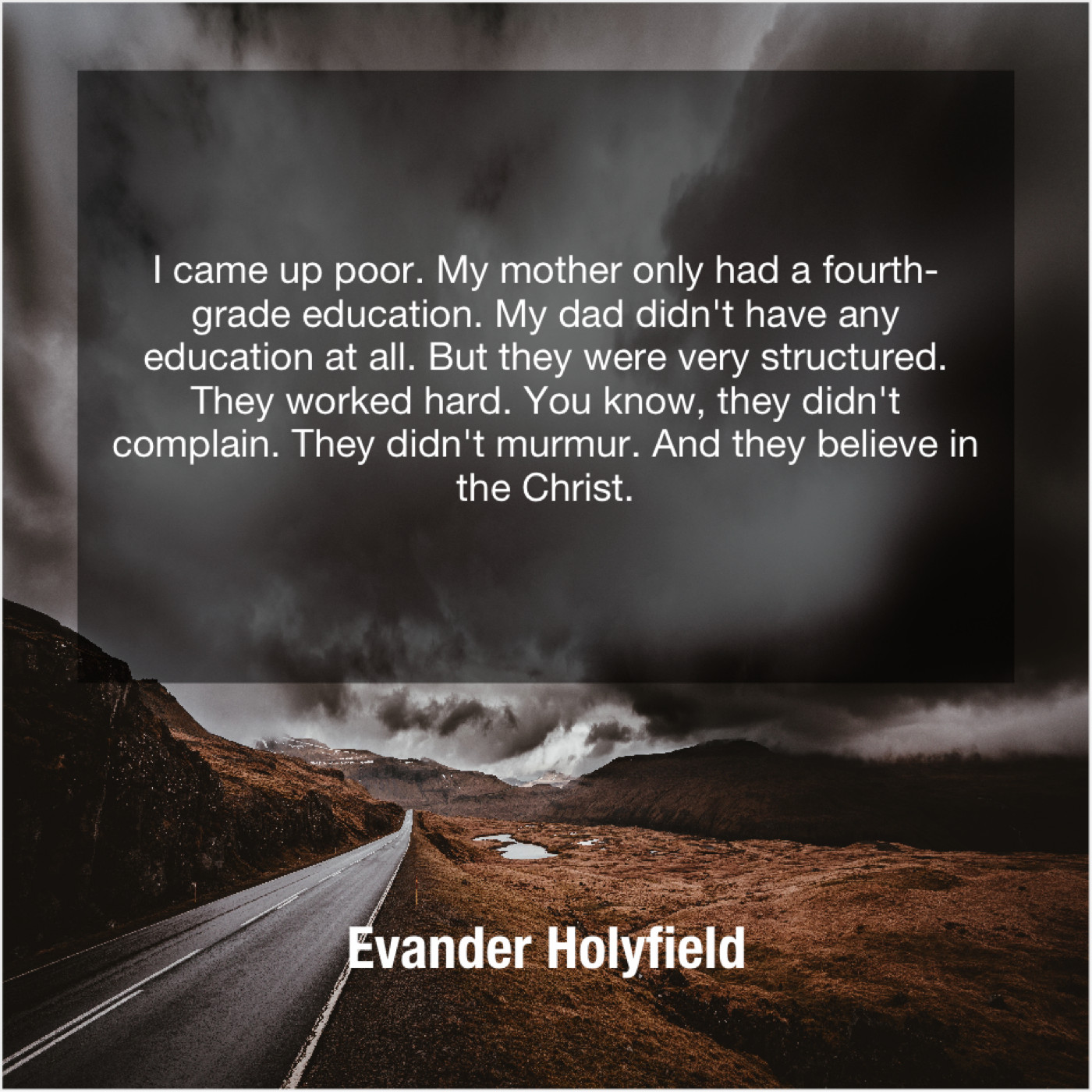 “I came up poor. My mother only had a fourth-grade education. My dad didn’t have any education at all. But they were very structured. They worked hard. You know, they didn’t complain. They didn’t murmur. And they believe in the Christ.”