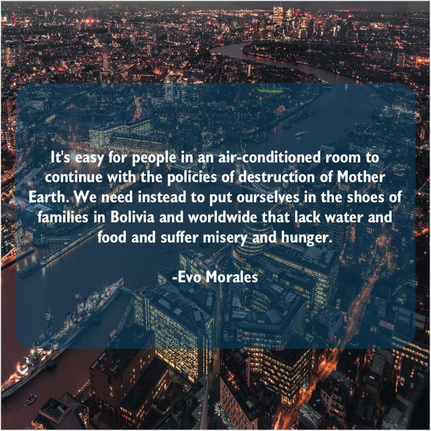 “It’s easy for people in an air-conditioned room to continue with the policies of destruction of Mother Earth. We need instead to put ourselves in the shoes of families in Bolivia and worldwide that lack water and food and suffer misery and hunger.”