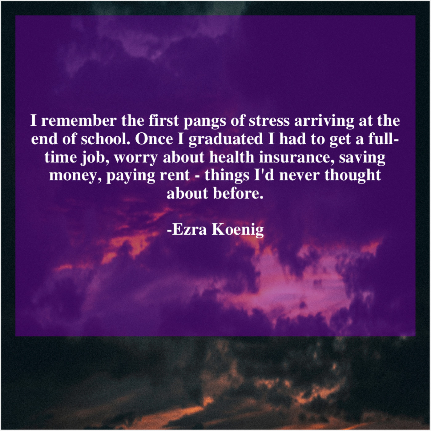 Ezra Koenig Ezra Koenig – I remember the first pangs… January 18, 2019 admin “I remember the first pangs of stress arriving at the end of school. Once I graduated I had to get a full-time job, worry about health insurance, saving money, paying rent – things I’d never thought about before.”-Ezra Koenig