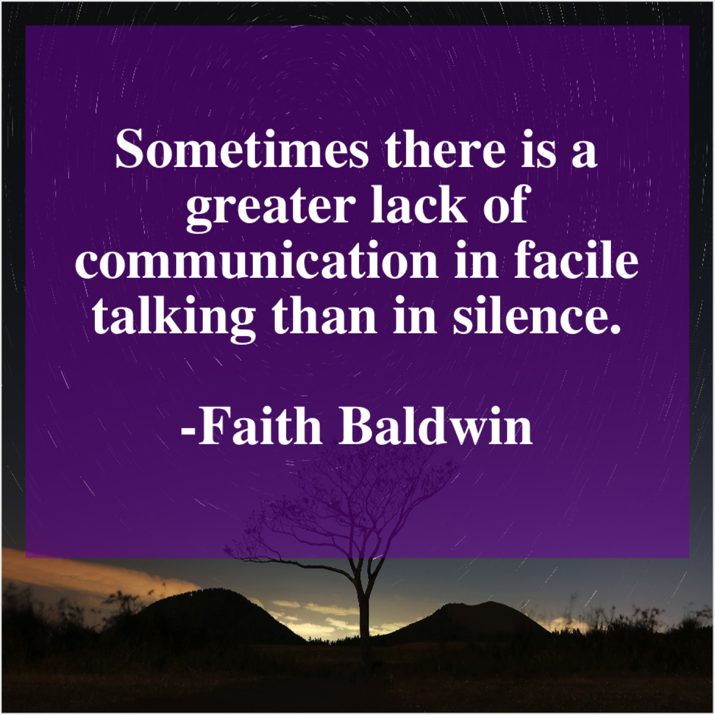 Faith Baldwin Faith Baldwin – Sometimes there is a greater… March 18, 2019 admin “Sometimes there is a greater lack of communication in facile talking than in silence.”-Faith Baldwin