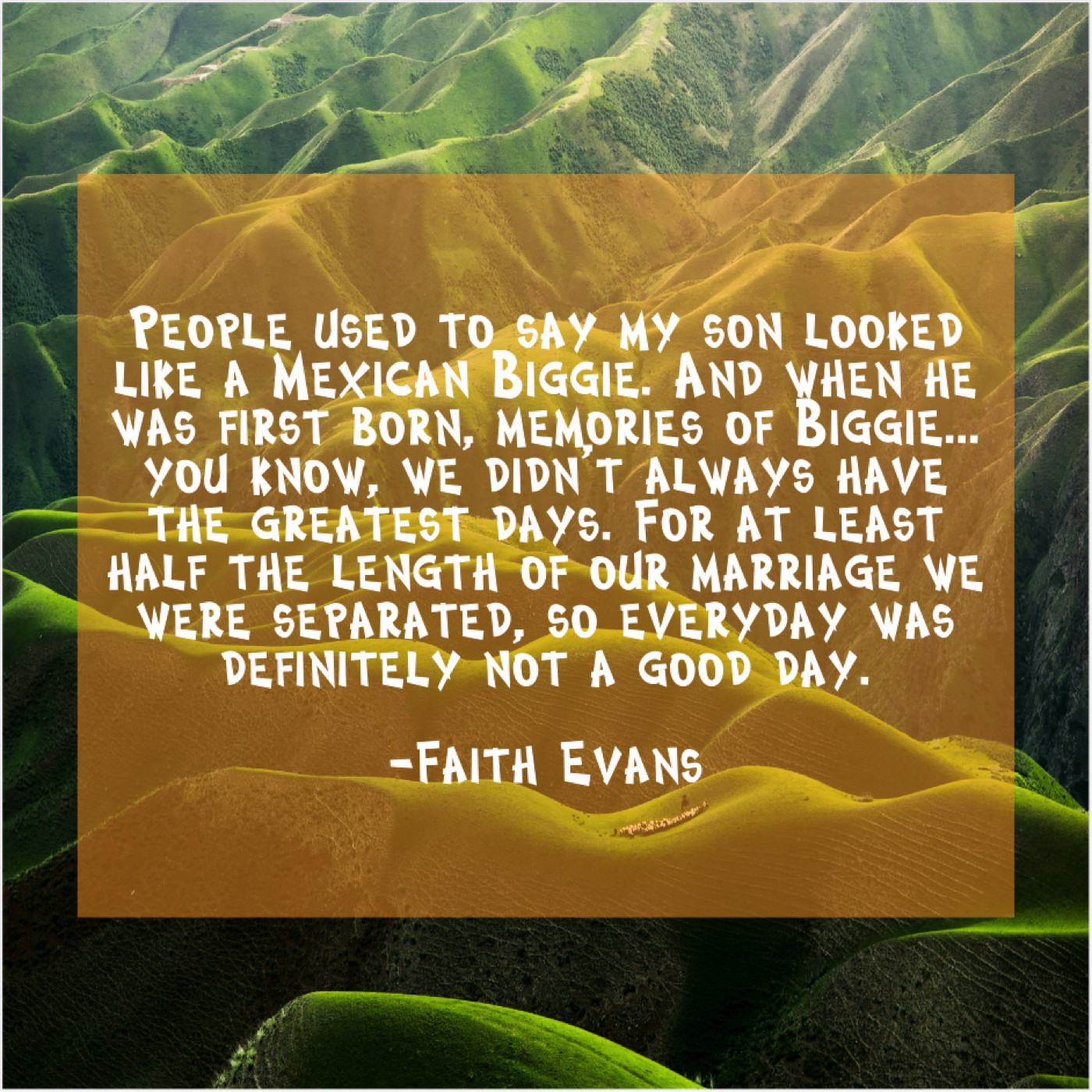 “People used to say my son looked like a Mexican Biggie. And when he was first born, memories of Biggie… you know, we didn’t always have the greatest days. For at least half the length of our marriage we were separated, so everyday was definitely not a good day.”