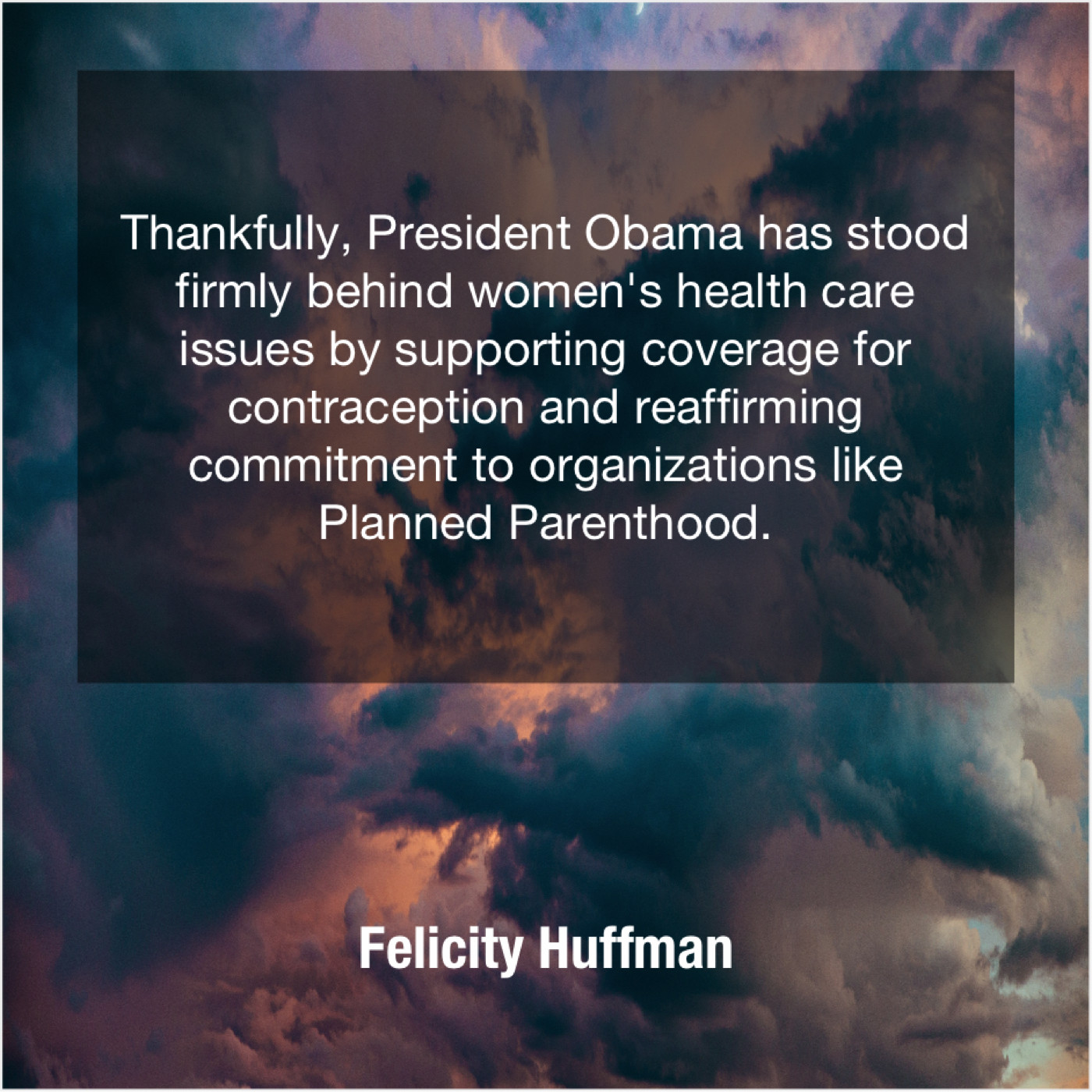 Felicity Huffman Felicity Huffman – Thankfully, President Obama has stood… October 10, 2019 admin “Thankfully, President Obama has stood firmly behind women’s health care issues by supporting coverage for contraception and reaffirming commitment to organizations like Planned Parenthood.”-Felicity Huffman