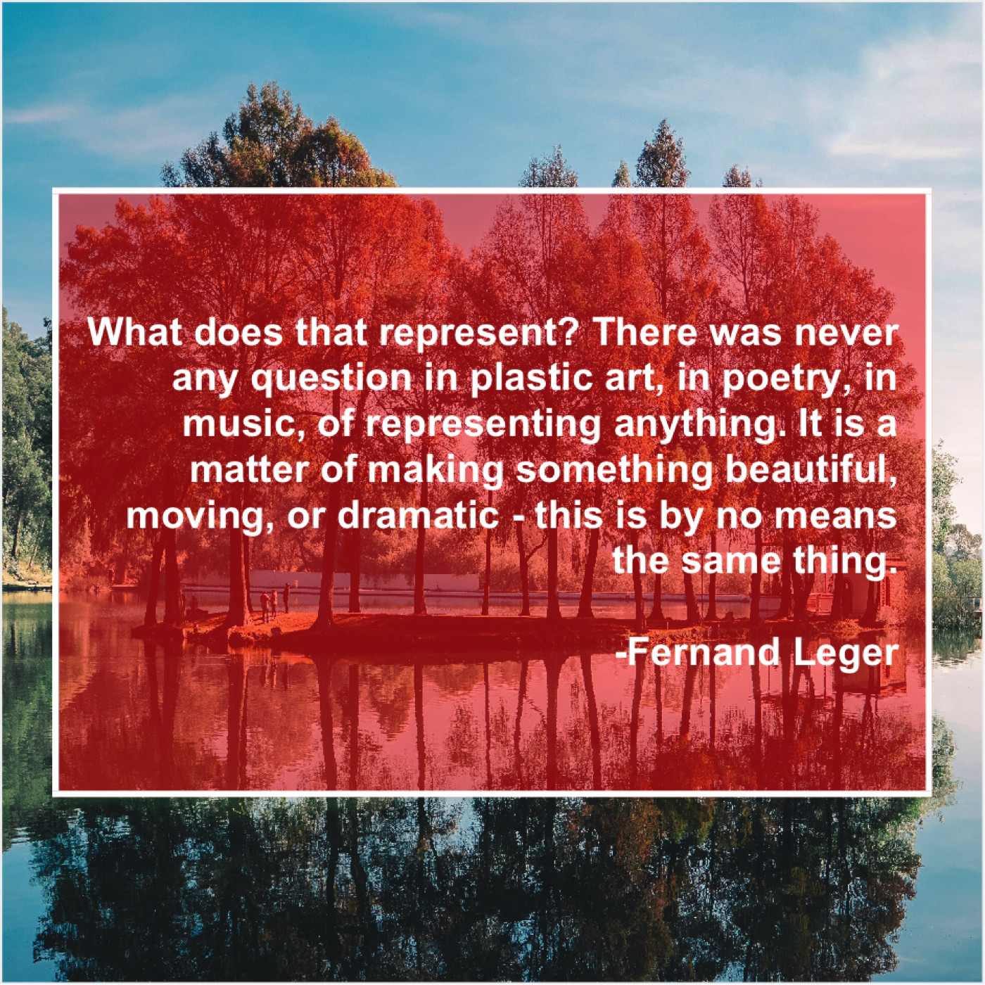 Fernand Leger Fernand Leger – What does that represent? There… December 28, 2018 admin “What does that represent? There was never any question in plastic art, in poetry, in music, of representing anything. It is a matter of making something beautiful, moving, or dramatic – this is by no means the same thing.”-Fernand Leger