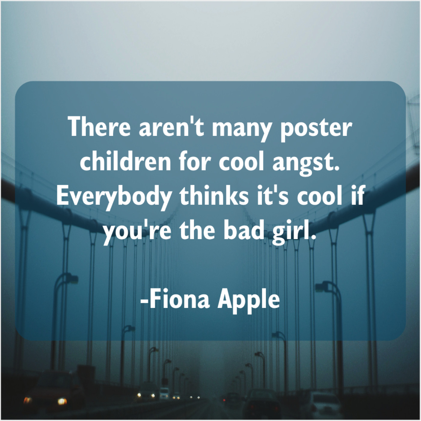 Fiona Apple Fiona Apple – There aren’t many poster children… November 19, 2018 admin “There aren’t many poster children for cool angst. Everybody thinks it’s cool if you’re the bad girl.”-Fiona Apple