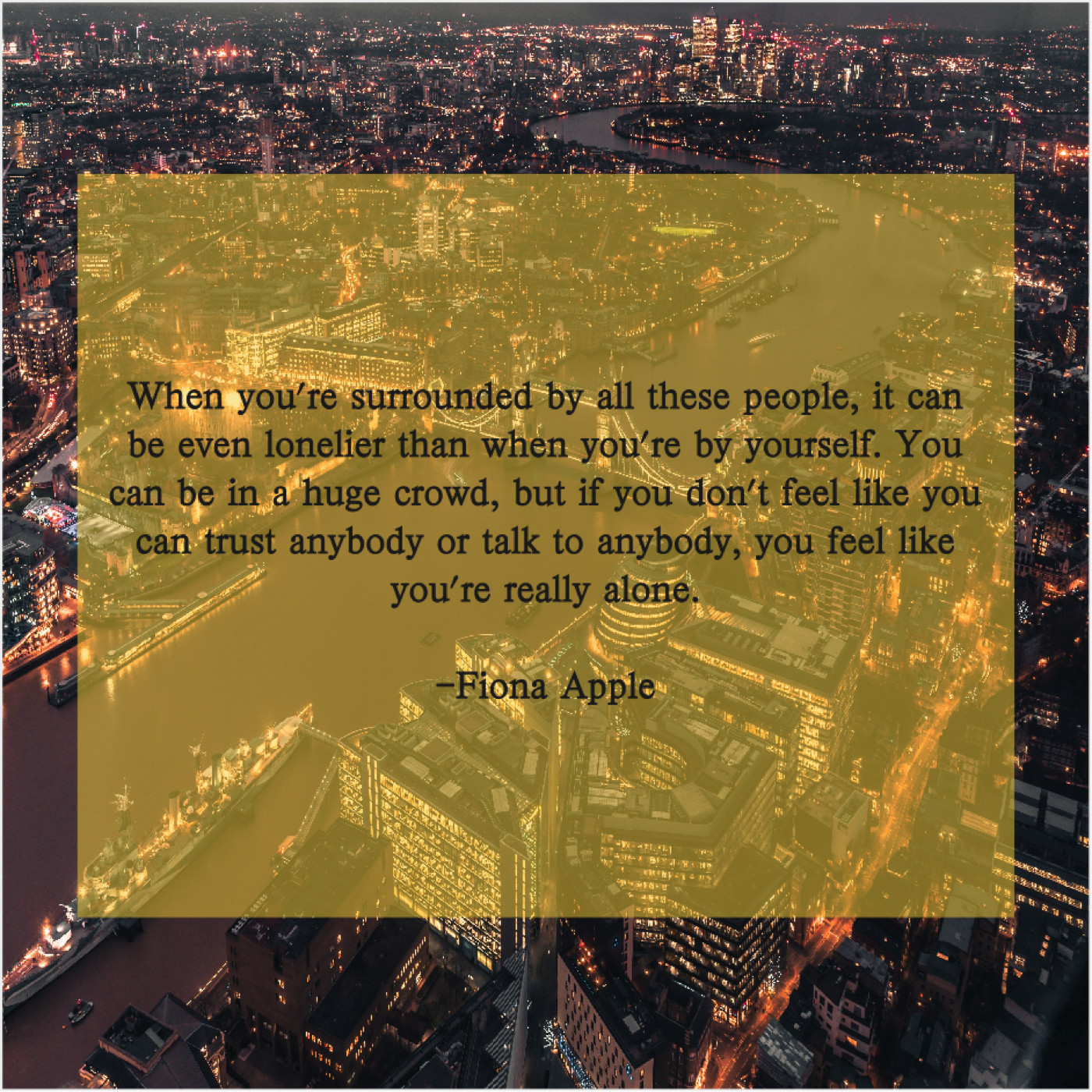 Fiona Apple Fiona Apple – When you’re surrounded by all… September 14, 2019 admin “When you’re surrounded by all these people, it can be even lonelier than when you’re by yourself. You can be in a huge crowd, but if you don’t feel like you can trust anybody or talk to anybody, you feel like you’re really alone.”-Fiona Apple