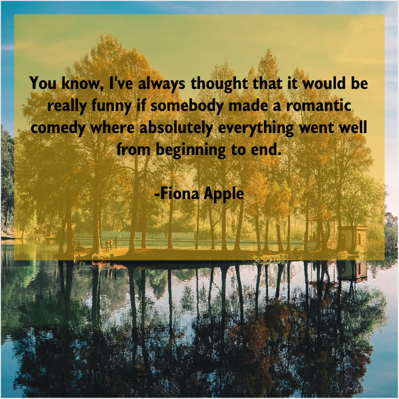 Fiona Apple Fiona Apple – You know, I’ve always thought… December 26, 2018 admin “You know, I’ve always thought that it would be really funny if somebody made a romantic comedy where absolutely everything went well from beginning to end.”-Fiona Apple
