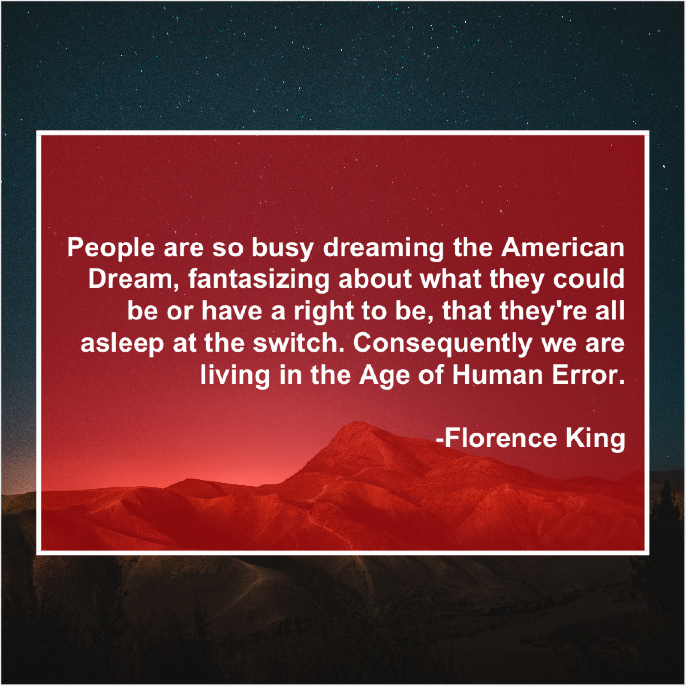 Florence King Florence King – People are so busy dreaming… August 24, 2019 admin “People are so busy dreaming the American Dream, fantasizing about what they could be or have a right to be, that they’re all asleep at the switch. Consequently we are living in the Age of Human Error.”-Florence King
