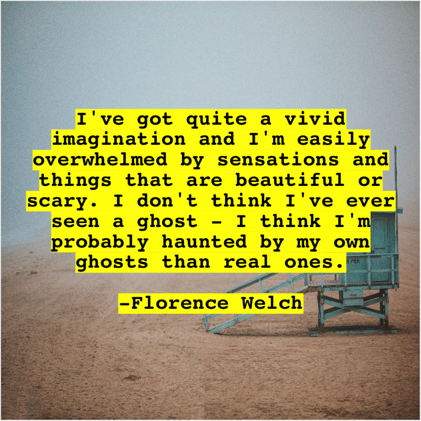 Florence Welch Florence Welch – I’ve got quite a vivid… August 28, 2019 admin “I’ve got quite a vivid imagination and I’m easily overwhelmed by sensations and things that are beautiful or scary. I don’t think I’ve ever seen a ghost – I think I’m probably haunted by my own ghosts than real ones.”-Florence Welch
