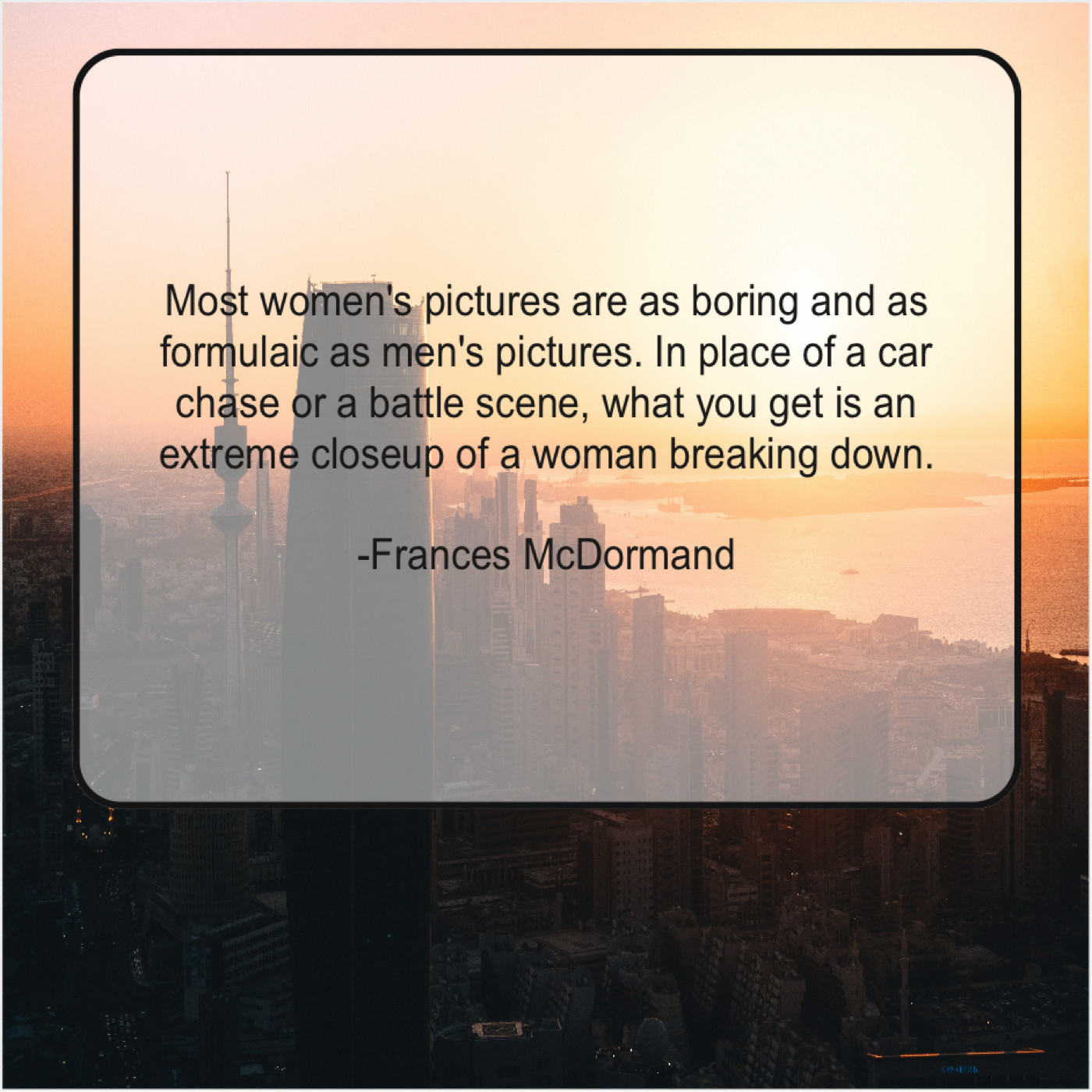 Frances McDormand Frances McDormand – Most women’s pictures are as… April 28, 2019 admin “Most women’s pictures are as boring and as formulaic as men’s pictures. In place of a car chase or a battle scene, what you get is an extreme closeup of a woman breaking down.”-Frances McDormand