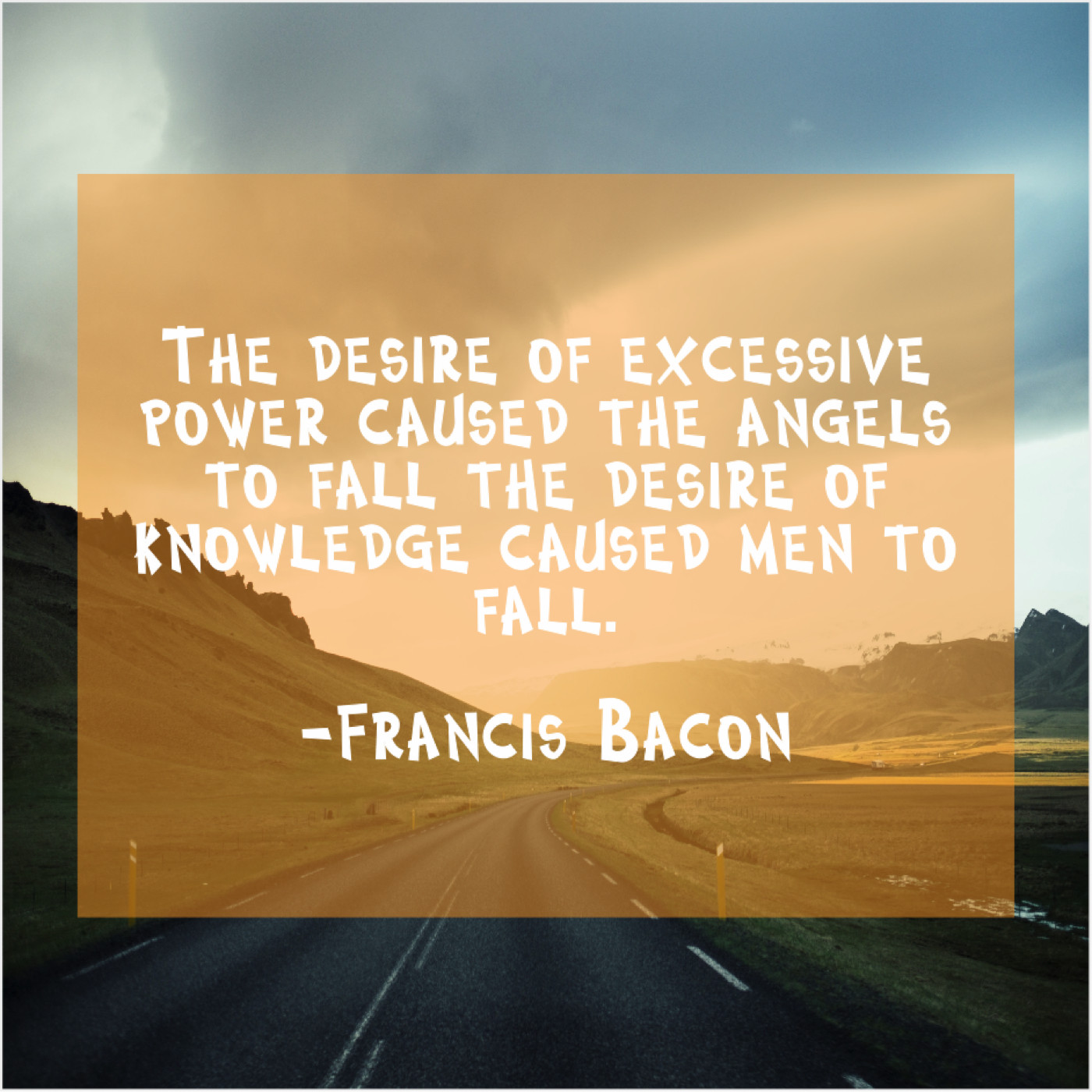 Francis Bacon Francis Bacon – The desire of excessive power… February 17, 2019 admin “The desire of excessive power caused the angels to fall the desire of knowledge caused men to fall.”-Francis Bacon