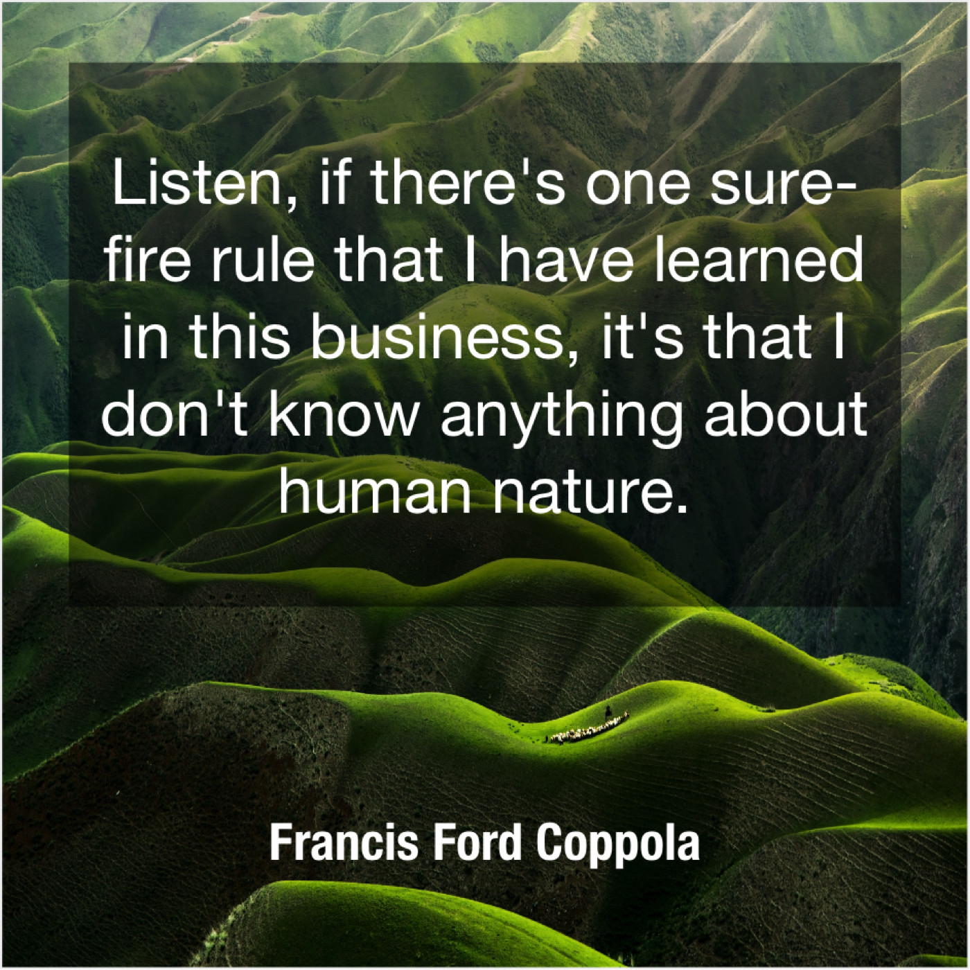 Francis Ford Coppola Francis Ford Coppola – Listen, if there’s one sure… October 20, 2019 admin “Listen, if there’s one sure-fire rule that I have learned in this business, it’s that I don’t know anything about human nature.”-Francis Ford Coppola
