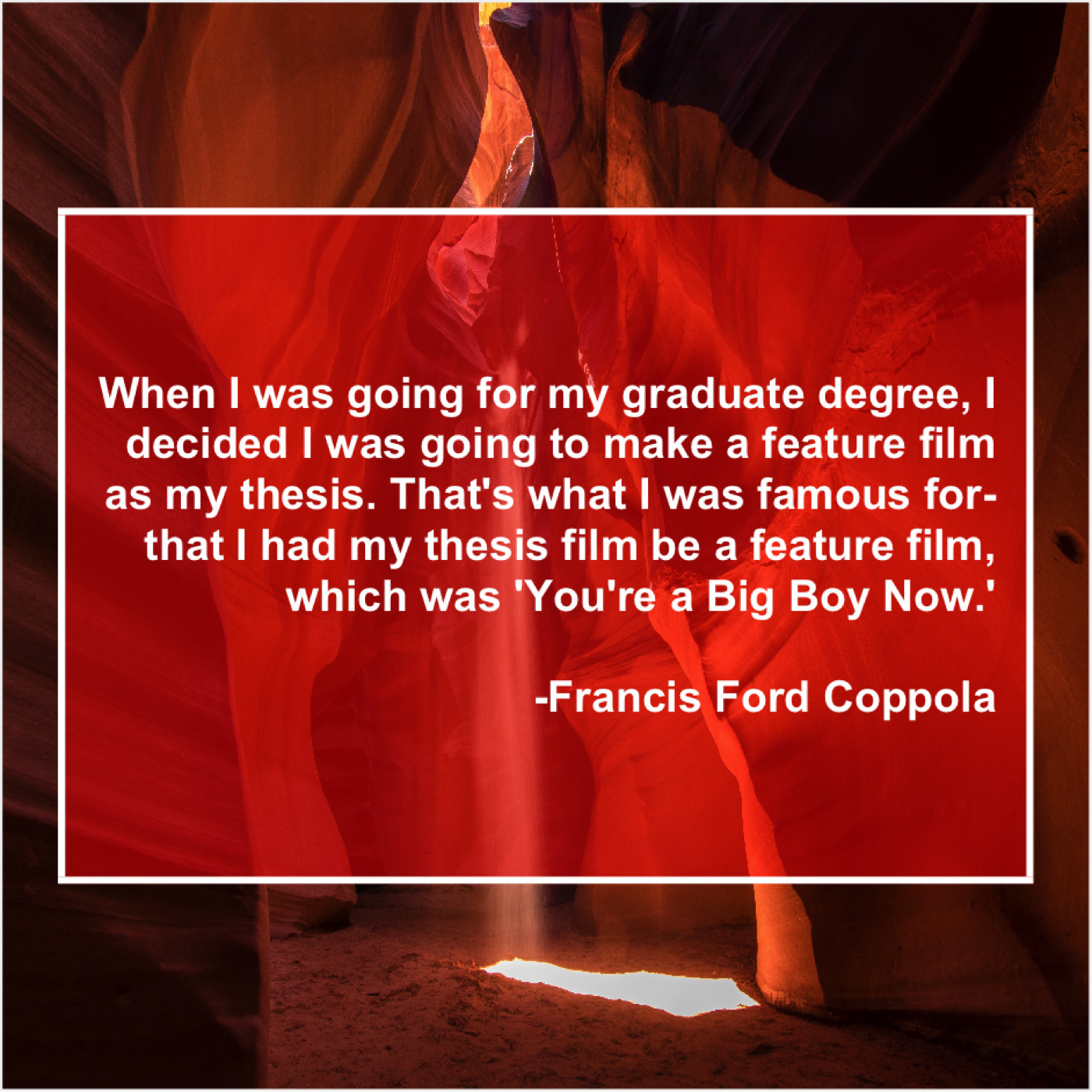 Francis Ford Coppola Francis Ford Coppola – When I was going for… October 8, 2019 admin “When I was going for my graduate degree, I decided I was going to make a feature film as my thesis. That’s what I was famous for-that I had my thesis film be a feature film, which was ‘You’re a Big Boy Now.'”-Francis Ford Coppola