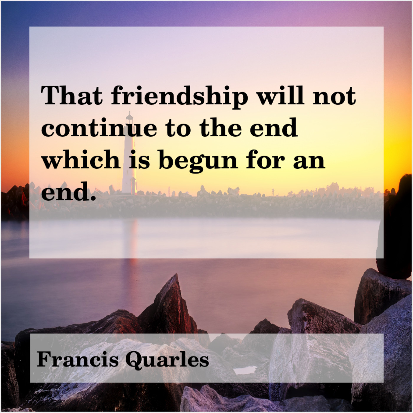 Francis Quarles Francis Quarles – That friendship will not continue… April 19, 2019 admin “That friendship will not continue to the end which is begun for an end.”-Francis Quarles