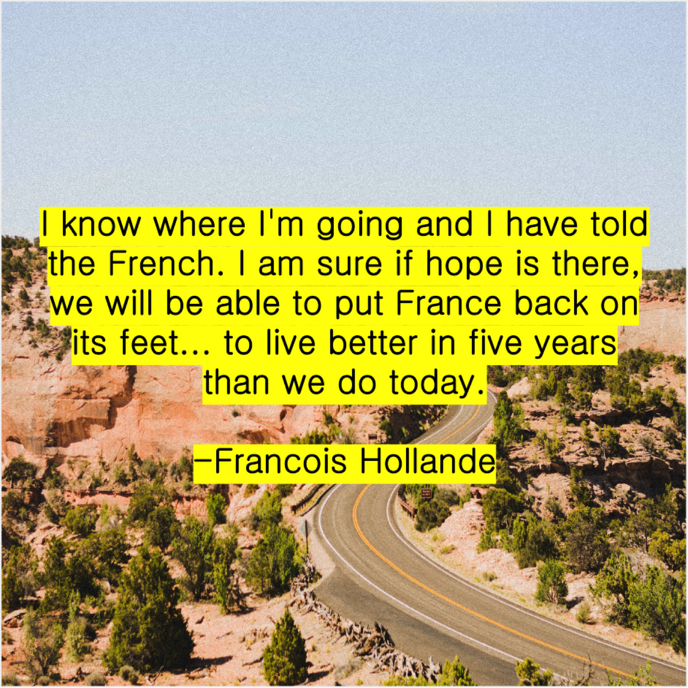 Francois Hollande Francois Hollande – I know where I’m going… July 31, 2019 admin “I know where I’m going and I have told the French. I am sure if hope is there, we will be able to put France back on its feet… to live better in five years than we do today.”-Francois Hollande