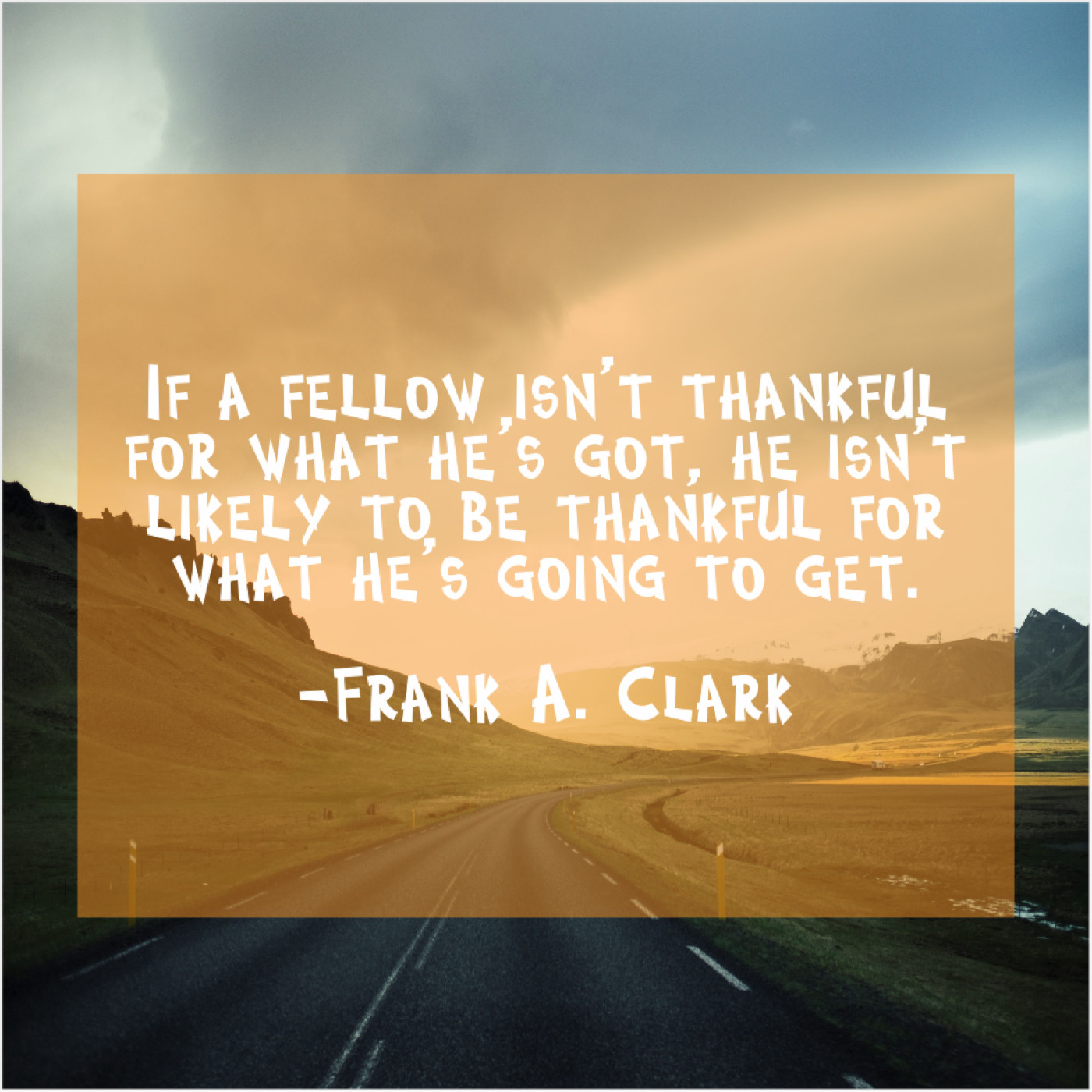 Frank A. Clark Frank A. Clark – If a fellow isn’t thankful… December 23, 2018 admin “If a fellow isn’t thankful for what he’s got, he isn’t likely to be thankful for what he’s going to get.”-Frank A. Clark