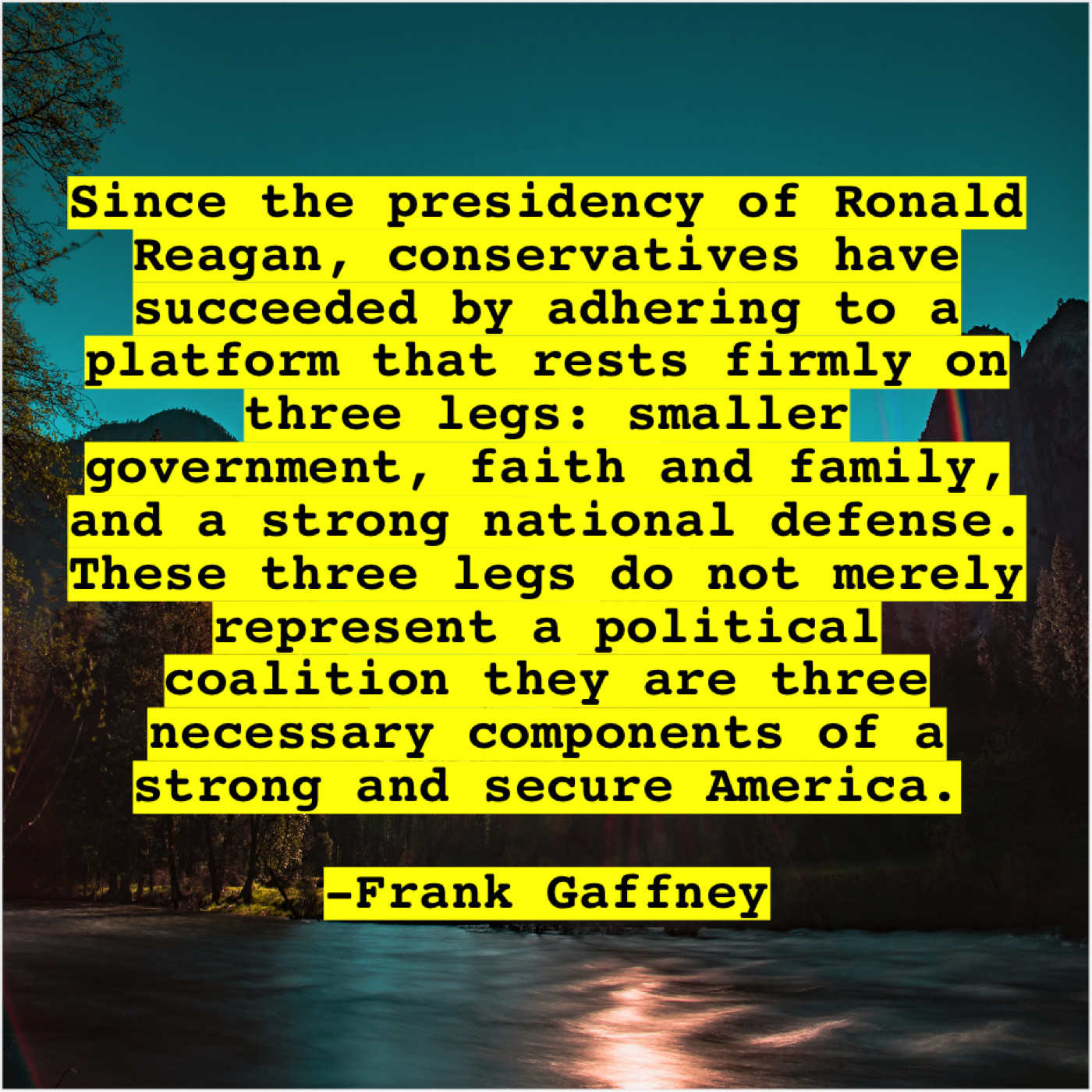 “Since the presidency of Ronald Reagan, conservatives have succeeded by adhering to a platform that rests firmly on three legs: smaller government, faith and family, and a strong national defense. These three legs do not merely represent a political coalition they are three necessary components of a strong and secure America.”