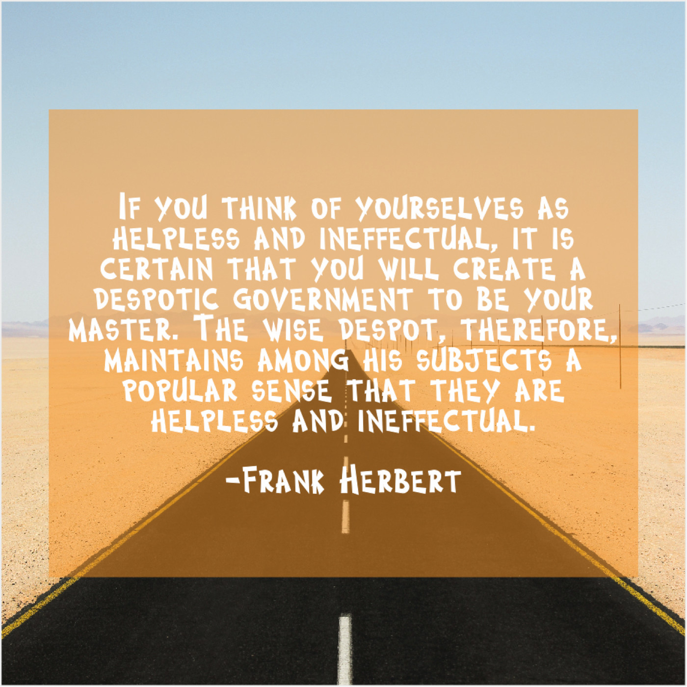 “If you think of yourselves as helpless and ineffectual, it is certain that you will create a despotic government to be your master. The wise despot, therefore, maintains among his subjects a popular sense that they are helpless and ineffectual.”