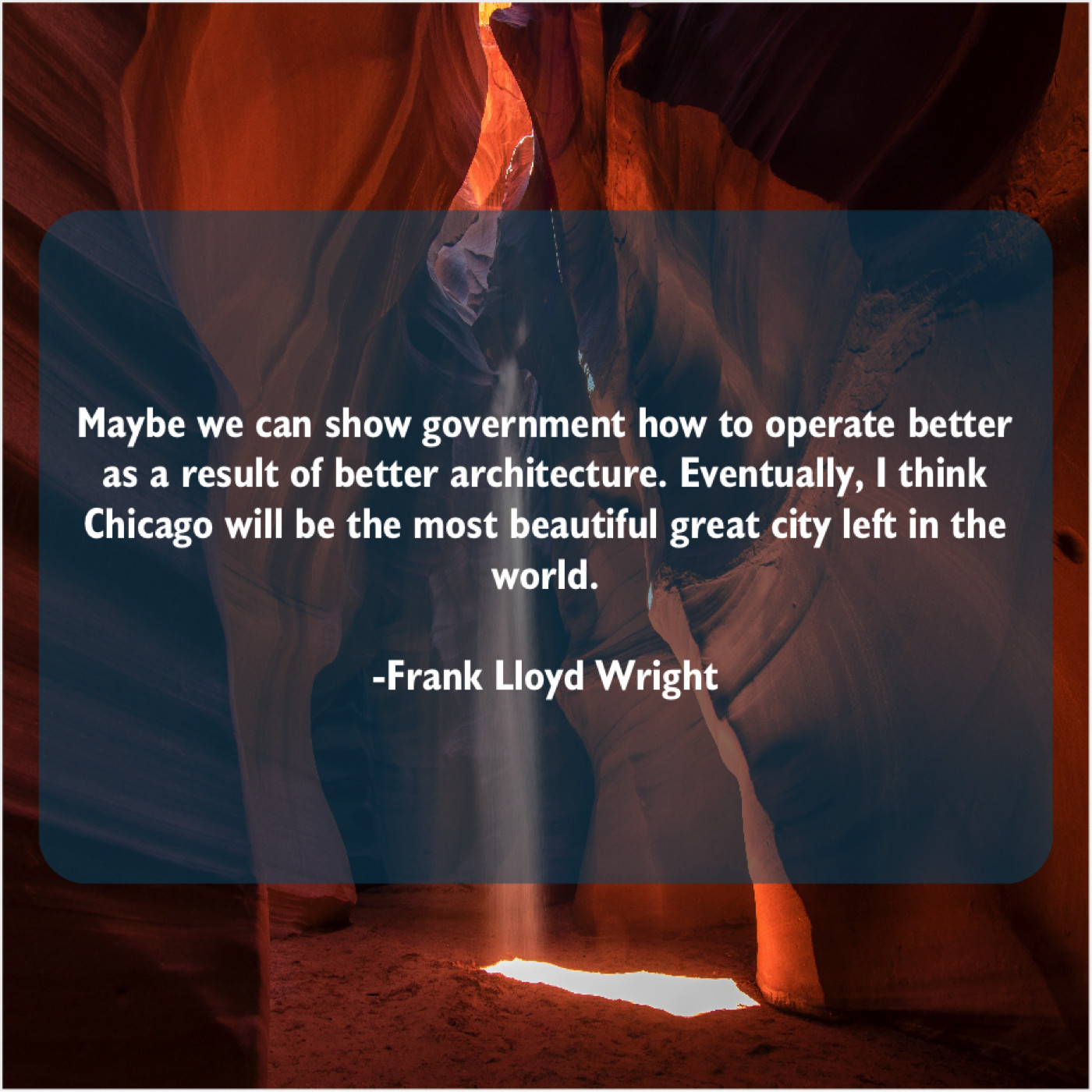 Frank Lloyd Wright Frank Lloyd Wright – Maybe we can show government… August 31, 2019 admin “Maybe we can show government how to operate better as a result of better architecture. Eventually, I think Chicago will be the most beautiful great city left in the world.”-Frank Lloyd Wright