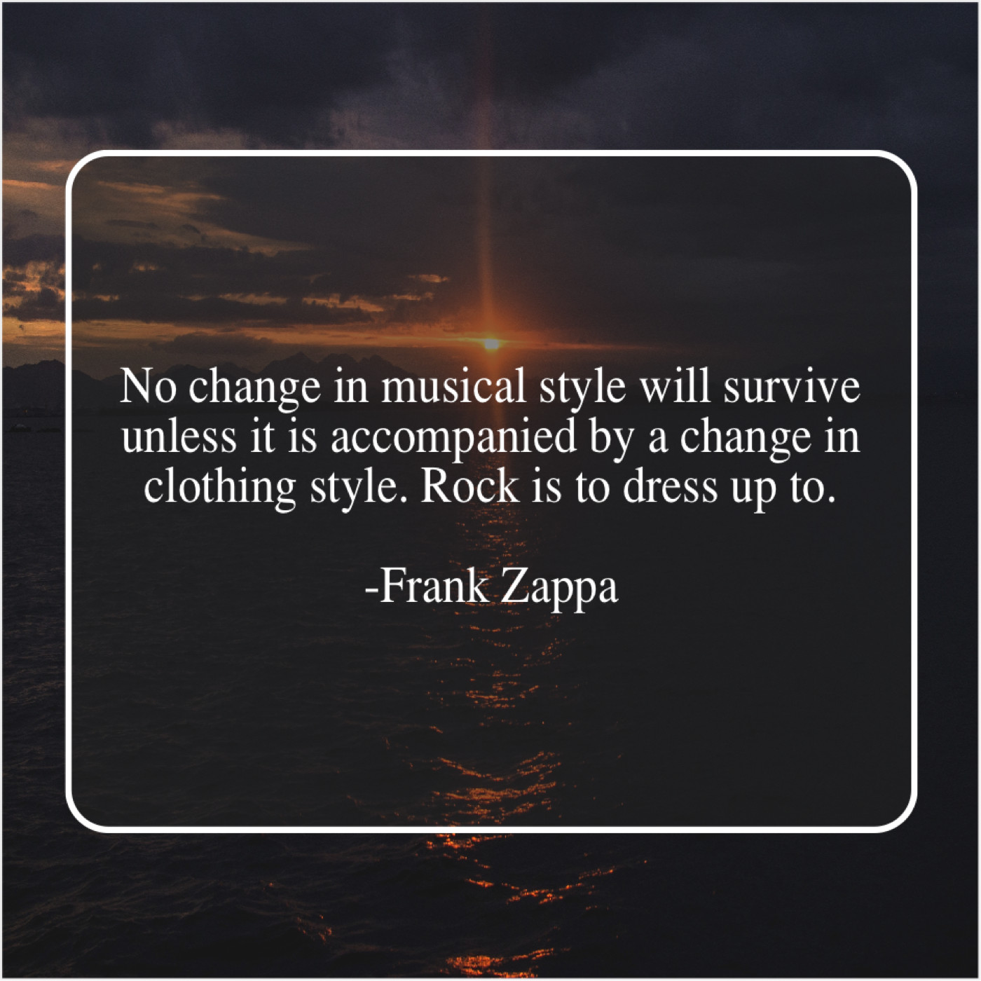 Frank Zappa Frank Zappa – No change in musical style… September 6, 2019 admin “No change in musical style will survive unless it is accompanied by a change in clothing style. Rock is to dress up to.”-Frank Zappa