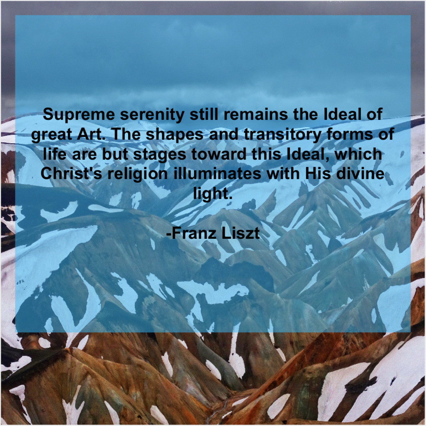 Franz Liszt Franz Liszt – Supreme serenity still remains the… August 1, 2019 admin “Supreme serenity still remains the Ideal of great Art. The shapes and transitory forms of life are but stages toward this Ideal, which Christ’s religion illuminates with His divine light.”-Franz Liszt