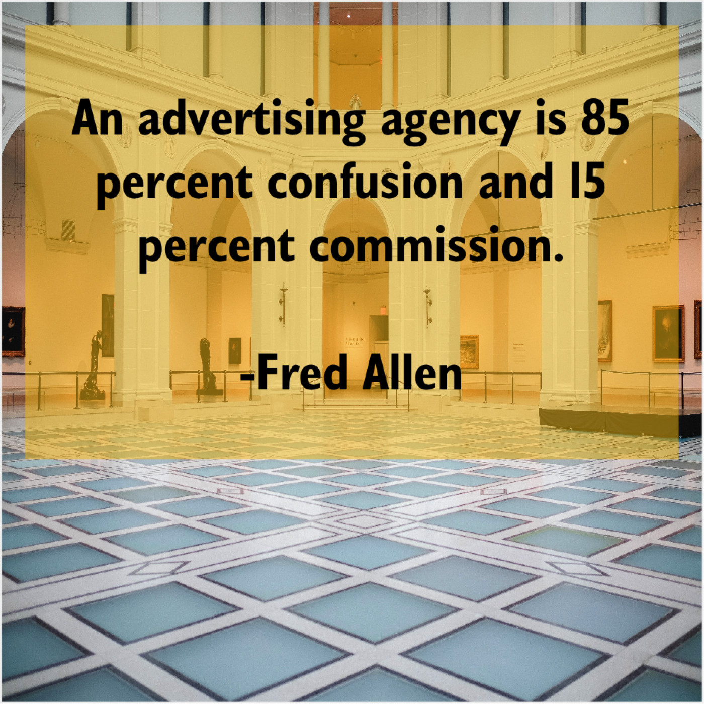 Fred Allen Fred Allen – An advertising agency is 85… January 15, 2019 admin “An advertising agency is 85 percent confusion and 15 percent commission.”-Fred Allen